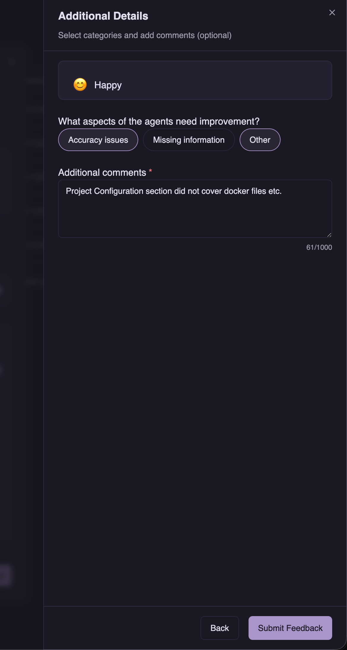 Unoplat Code Confluence includes a feedback system that allows you to share your experience with AI agent generation results. Your feedback helps improve the quality of generated documentation and is submitted as a GitHub issue for tracking and follow-up.