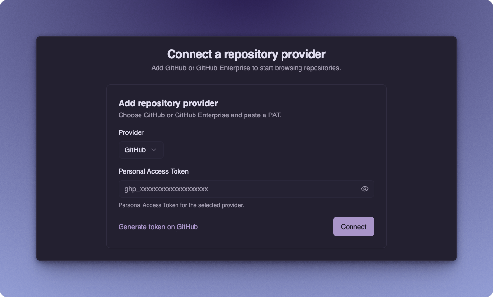 - When prompted, select your repository provider and enter a Personal Access Token (PAT) with read access to the repositories you want to ingest.