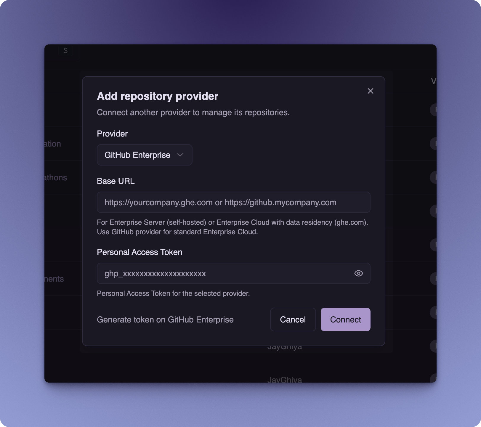 https://yourcompany.ghe.comorhttps://github.mycompany.com) - Enter your Personal Access Token